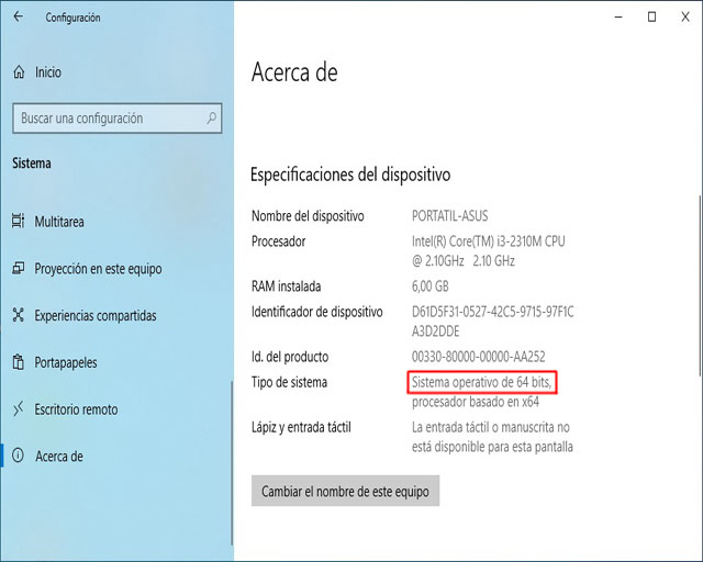 | Desde Windows 8 ó 10: 1. Pulsamos sobre el botón Inicio. 2. Nos vamos a Configuración. 3. Luego a Sistema. 4. Finalmente, desde el menú lateral, entramos en Acerca de y en el apartado Especificaciones del dispositivo podremos ver el tipo de arquitectura. |